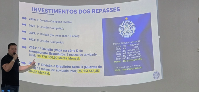 Durante este período, o Clube recebeu aporte do Poder Público de pouco mais de R$ 10 milhões, sendo que só em 2025 foram quase R$ 6 milhões, tendo em vista o calendário anual com a volta do Goiatuba ao cenário nacional com sua participação na Série D do Brasileirão.