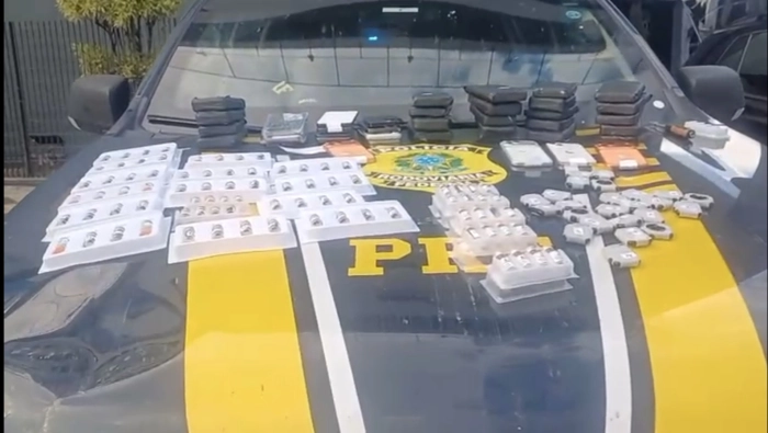 No porta-malas, foram encontradas ampolas de um medicamento de uso controlado, indicado para o tratamento de diabetes e também utilizado para emagrecimento. Diante da suspeita de que havia mais produtos irregulares, os agentes realizaram uma busca minuciosa e localizaram cerca de 104 ampolas da substância, além de 69 celulares, 24 relógios inteligentes, outros eletrônicos, cosméticos e bebidas. Parte da carga estava escondida em compartimentos ocultos no painel do carro.