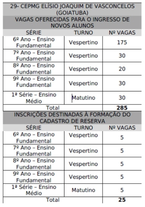 O CEPMG de Goiatuba oferece vagas do 6° Ano do Ensino Fundamental à 1ª Série do Ensino Médio, conforme quadro: