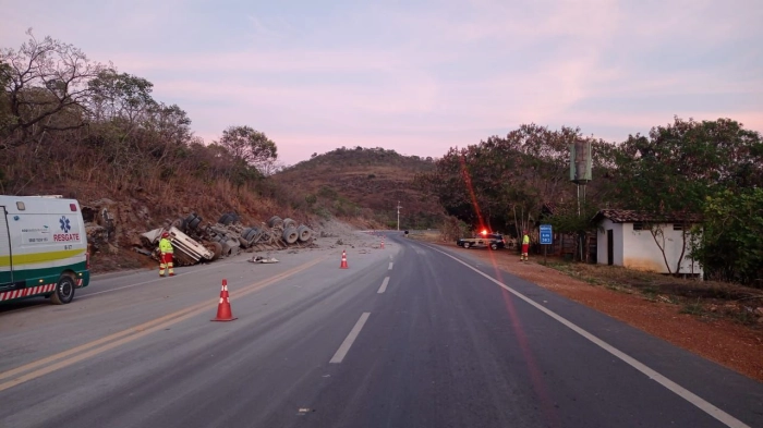 A Polícia Rodoviária Federal atendeu, na madrugada desta quarta-feira (1º), um acidente no km 383 da BR-414, em Corumbá de Goiás. Uma carreta carregada de cimento tombou e o motorista morreu no local.